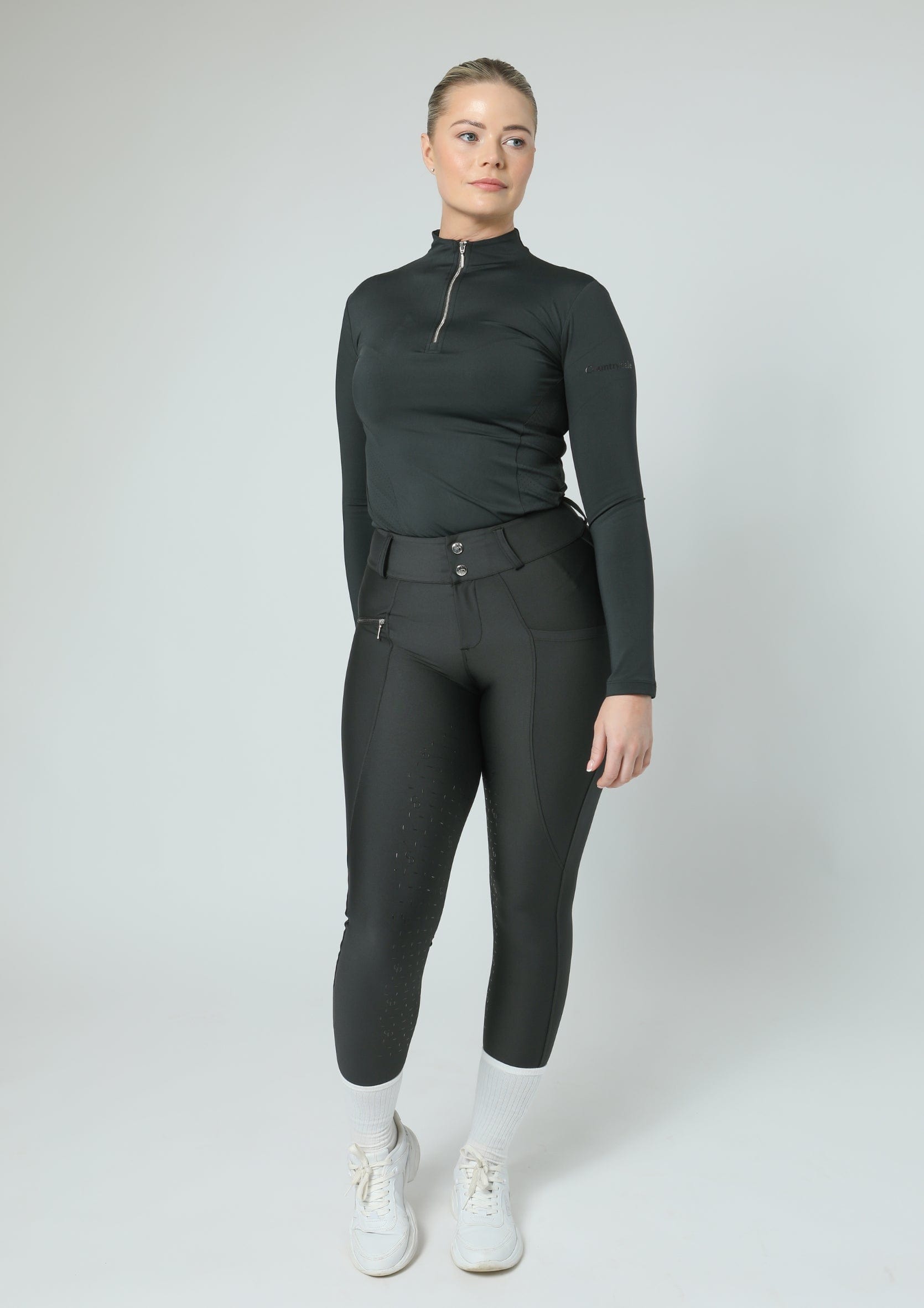Die Protech Breggings bringen Eleganz und Performance in jeden Ausritt. Mit einem Silikon-Vollbesatz für Stabilität, einem hoch taillierten Design mit Gürtelschlaufen und stützendem Kompressionsgewebe bieten sie Komfort und Kontrolle im Sattel. Mit zwei Taschen und einer schmeichelhaften Passform sind sie die perfekte Mischung aus Funktion und Stil für den Alltagsreiter.